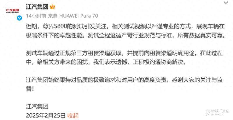 江汽集团在声明中强调,测试车辆通过正规第三方租赁渠道获取,并已提前向租赁方明确车辆用途。测试全程遵循严苛的行业规范和标准,所有数据真实可靠。江汽集团表示,尊界S800的相关测试以严谨专业的方式进行,旨在展现车辆在极端条件下的性能表现。